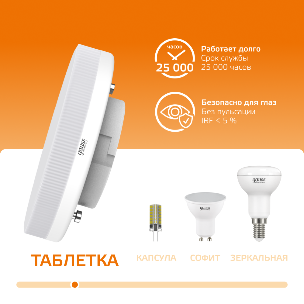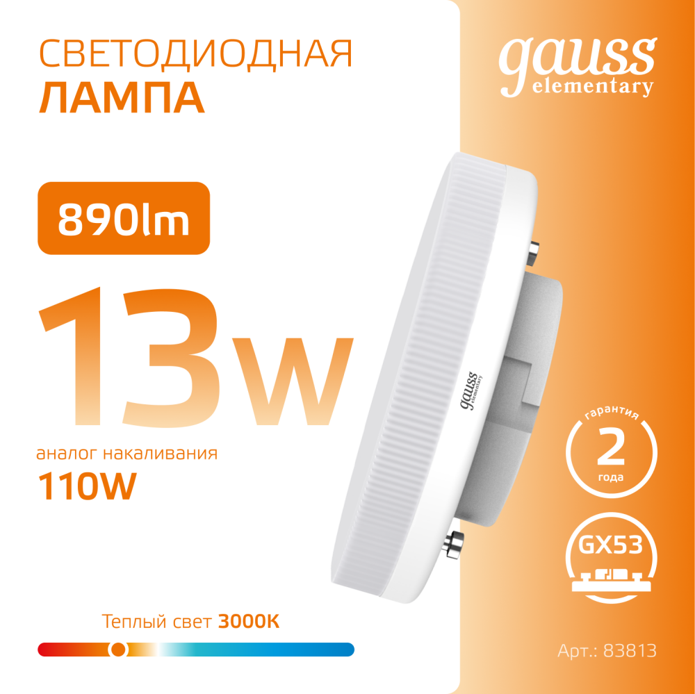 Полное описание товара Лампа светодиодная LED 13 Вт 890 лм 3000К таблетка теплый GX53 AC 220В Elementary (GAUSS) 83813