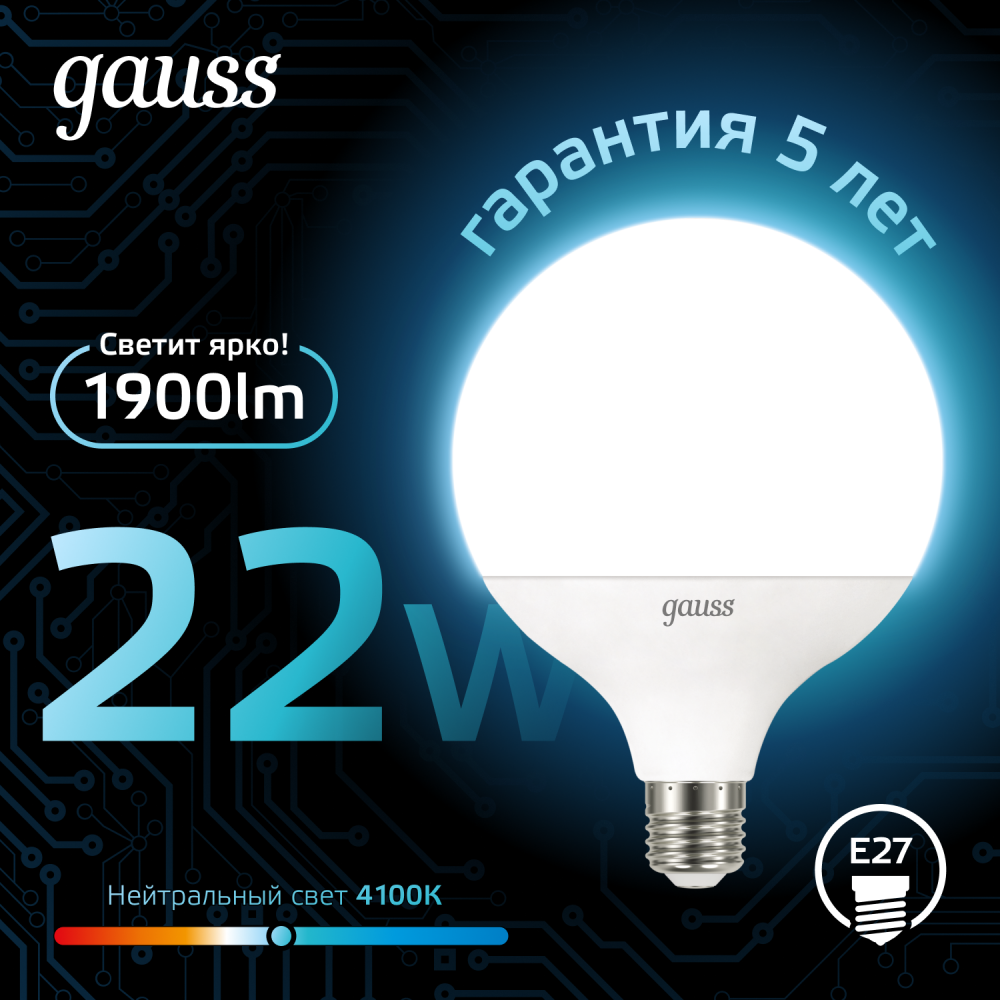Полное описание товара Лампа светодиодная LED 22 Вт 1900 лм 4100К шар G125 нейтральный E27 AC 220В Black Gauss (GAUSS) 105102222