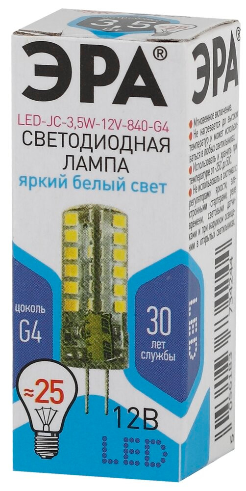 Полное описание товара Лампа светодиодная LED 3,5 Вт 280Лм 4000К капсула нейтральный G4 12В LED JC-3,5W-12V-840-G4 Standart (ЭРА) Б0033196