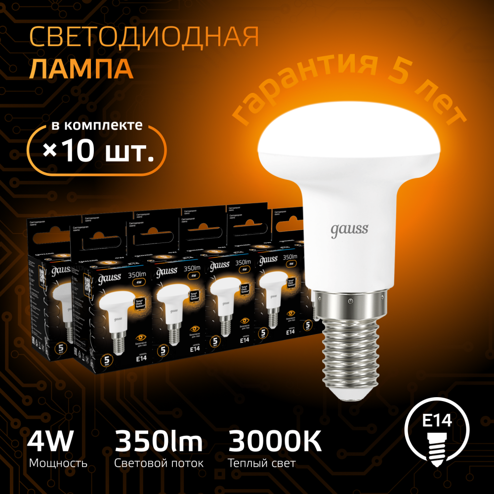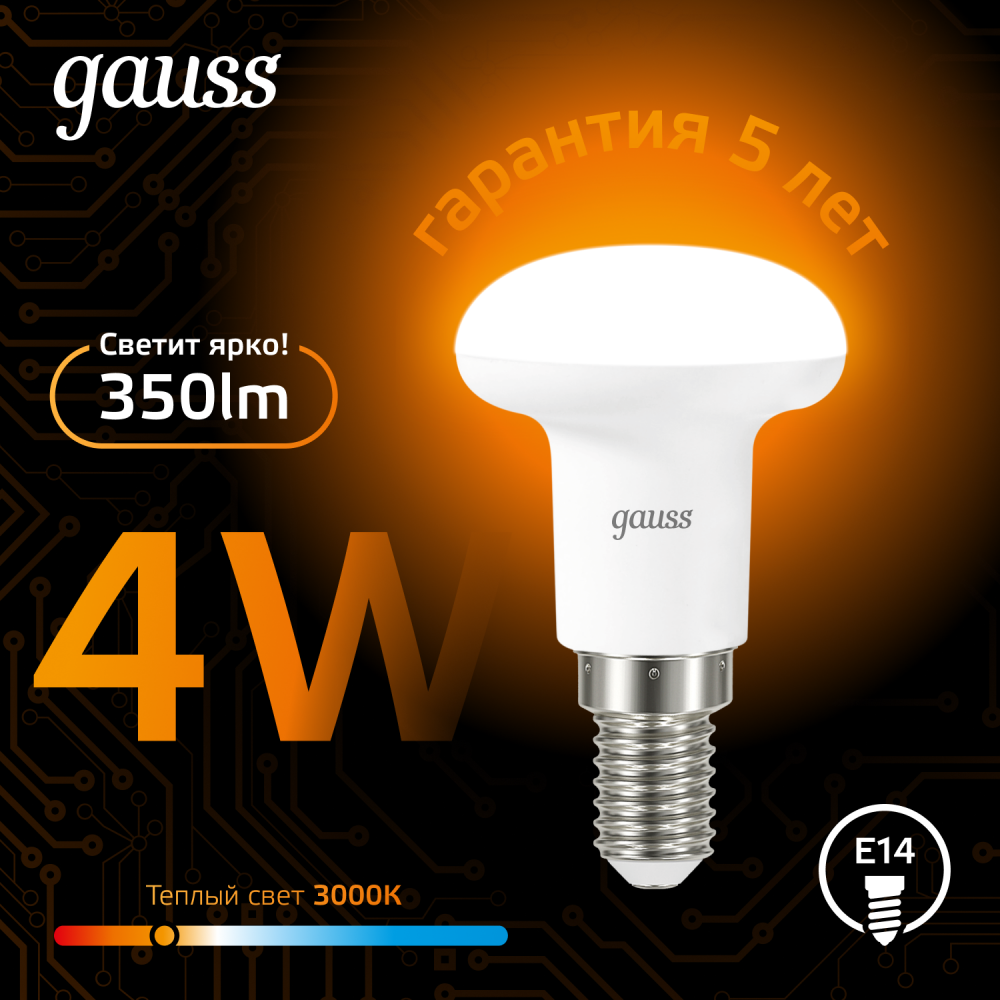 Полное описание товара Лампа светодиодная LED 4 Вт 350 лм 3000К грибок R39 теплый E14 AC 220В Black (GAUSS) 106001104