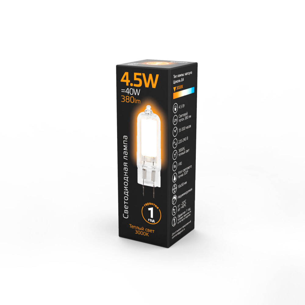 Полное описание товара Лампа светодиодная LED 4.5 Вт 380 лм 3000К капсула теплый G4 AC 220В стеклянная Black (GAUSS) 107807104