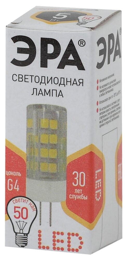 Полное описание товара Лампа светодиодная LED 5 Вт 400Лм 2700К капсула теплый G4 170-265В LED JC-5W-220V-CER-827-G4 Standart (ЭРА) Б0027857