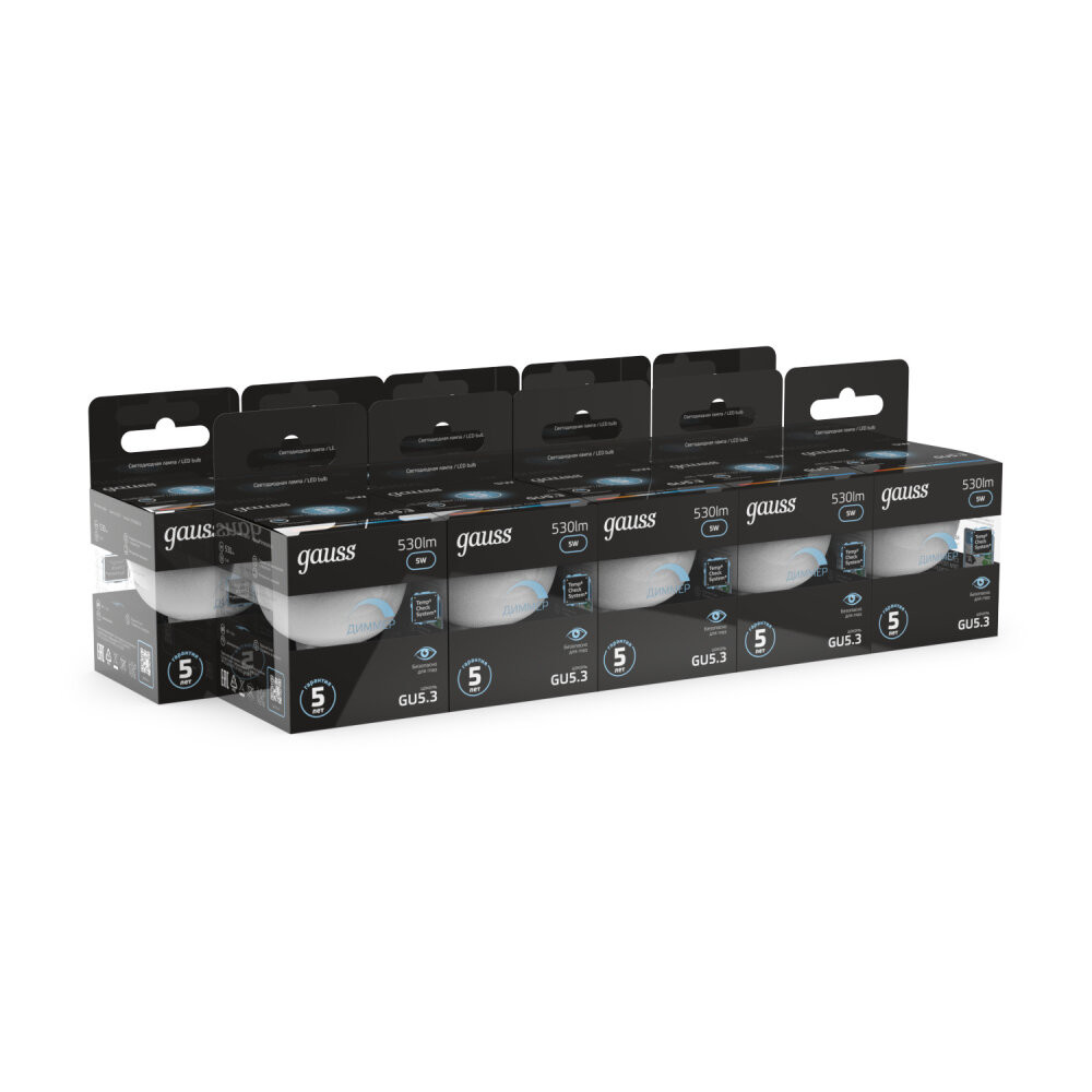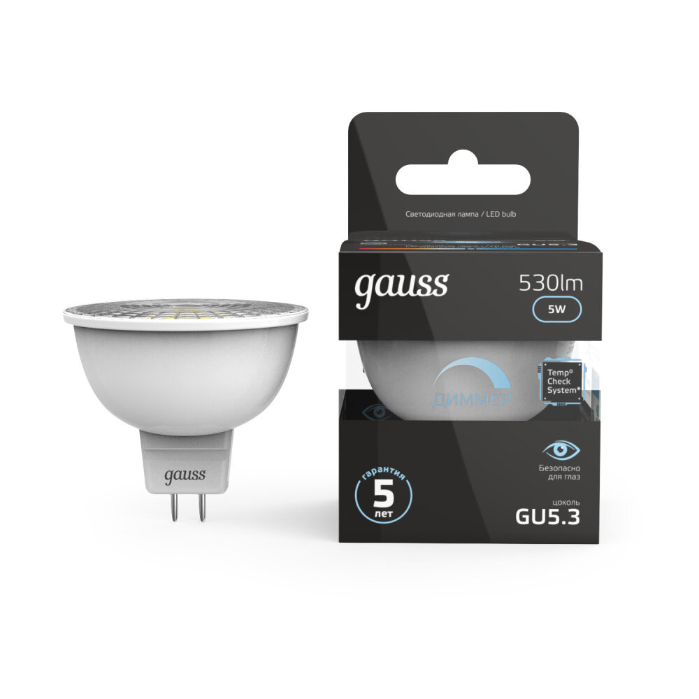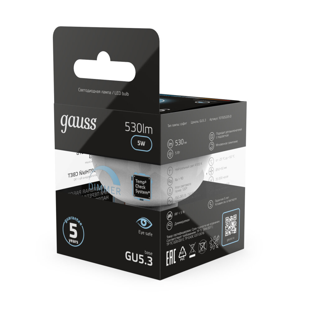 Полное описание товара Лампа светодиодная LED 5 Вт 530 лм 4100К софит MR16 нейтральный GU5.3 AC 220В диммируемая Black (GAUSS) 101505205-D