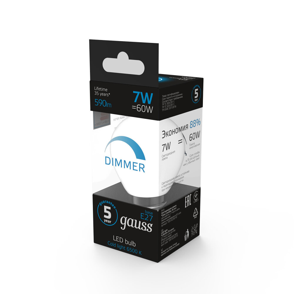 Полное описание товара Лампа светодиодная LED 7 Вт 590 лм 6500К шар P45 холодный E27 AC 220В диммируемая Black Gauss (GAUSS) 105102307-D