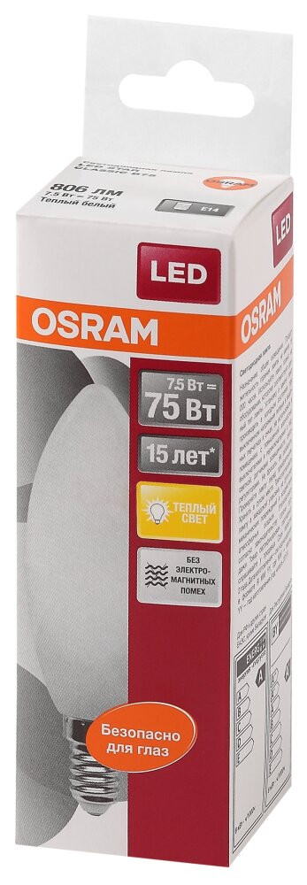 Полное описание товара Лампа светодиодная LED 8Вт E14 CLB75 тепло-бел, матов.свеча OSRAM (LEDVANCE) 4058075210684