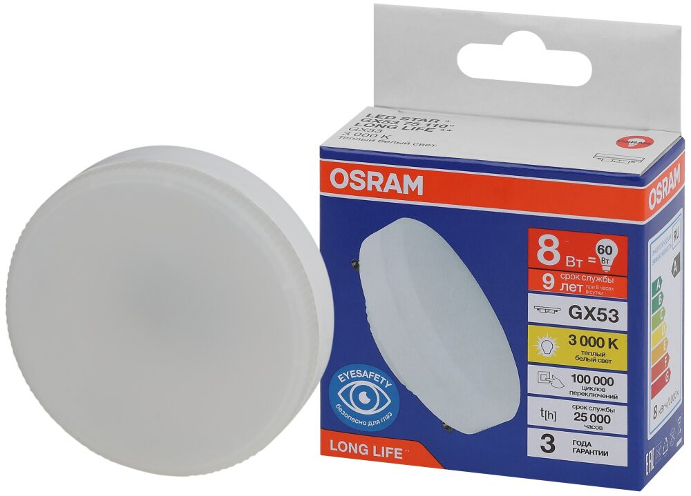 Полное описание товара Лампа светодиодная LED 8Вт GX53 3000К 640Лм спот 220В (замена 60Вт) OSRAM (LEDVANCE) 4099854185694