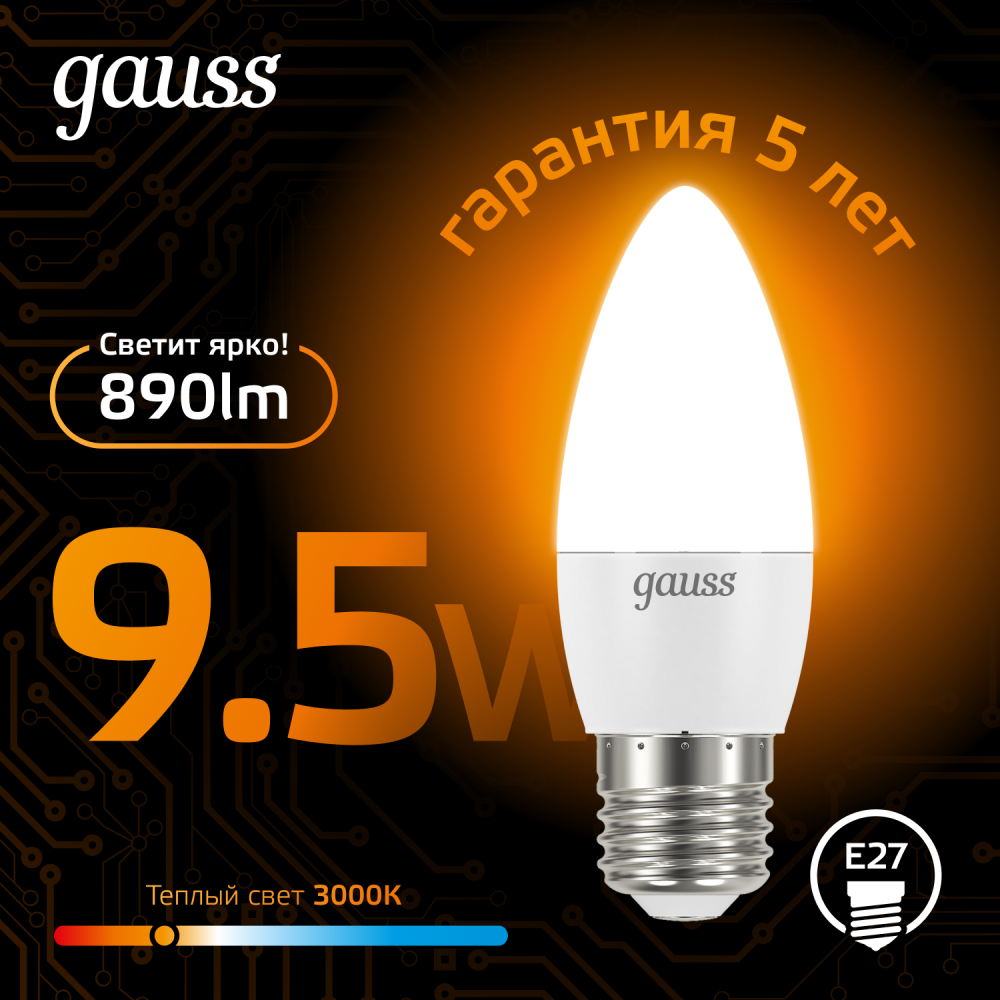 Полное описание товара Лампа светодиодная LED 9.5 Вт 890 лм 3000К свеча теплый E27 AC 220В Black (GAUSS) 103102110
