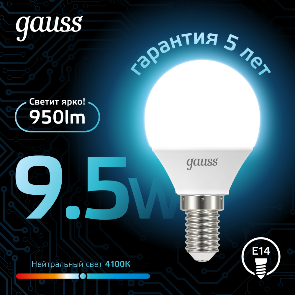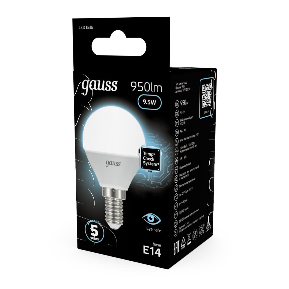 Лампа светодиодная LED 9.5 Вт 950 лм 4100К шар P45 нейтральный E14 AC 220В Black (GAUSS) 105101210