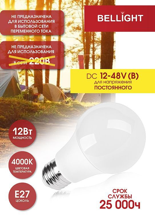 Полное описание товара Лампа светодиодная LED A60 Е27 12W 12-48вольт 4000К (BELLIGHT) 85637131