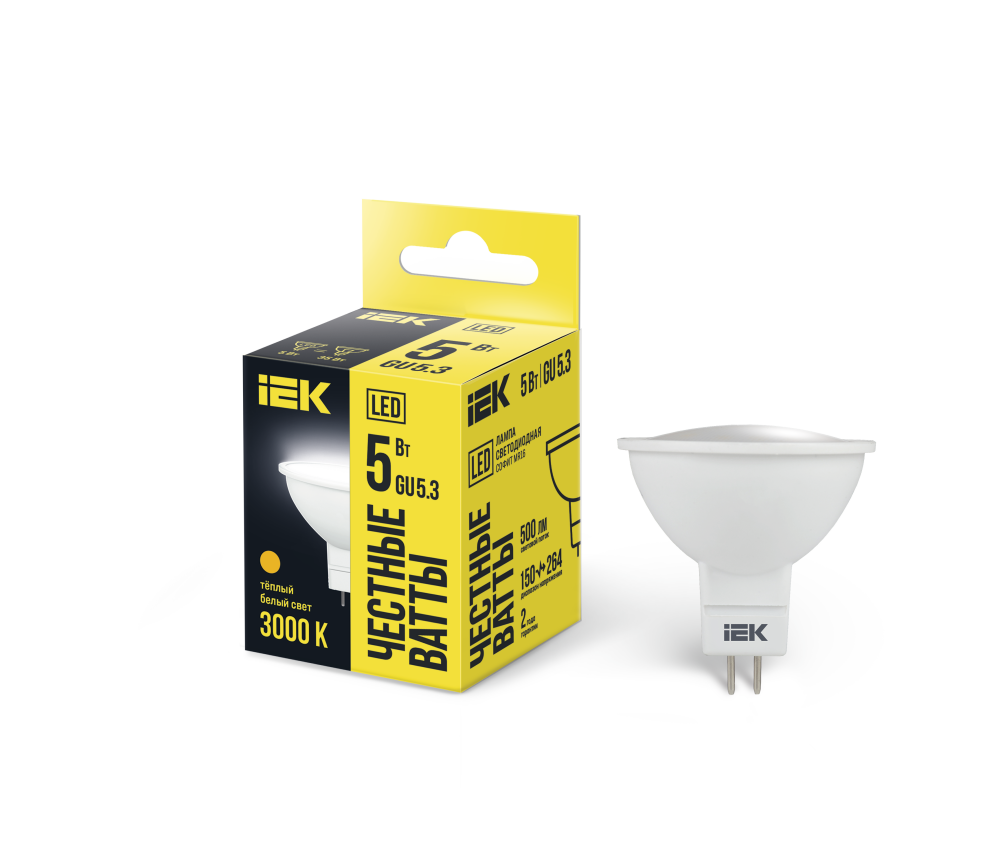 Лампа LED MR16 софит 5Вт 230В 3000К GU5.3 IEK. Светодиодные лампы предназначены для использования в осветительных приборах наружного и внутреннего освещения объектов промышленного, коммерческого и бытового назначения. Соответствуют требованиям Технических регламентов Таможенного союза ТР ТС 004/2011, ТР ТС 020/2011, МЭК 62560, Постановления Правительства РФ от 10.11.2017 № 1356.