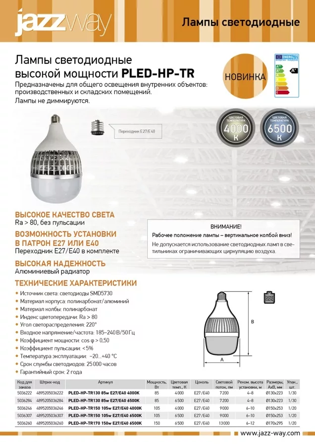 - Преимущества: Высокое качество света|Ra больше 80|Без пульсации|Возможность установки в патрон е27 или е40 переходник е27/е40 в комплекте|Высокая надежность|Алюминиевый радиатор