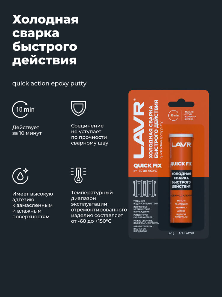 Полное описание товара LAVR Холодная сварка Быстрого действия QuickFIX, 60 г Ln1720 (LAVR)