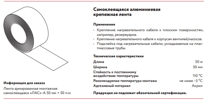 Лента алюминиевая монтажная самоклеящаяся - представляет собой алюминиевую фольгу с клеевым слоем, который защищен специальной пленкой, позволяющей легко наносить ленту. Лента выпускается в виде рулона. Она используется для крепления нагревательного кабеля к различным поверхностям, таким как трубы или резервуары, корпусы, насосы. Лента обеспечивает надежное крепление кабеля.