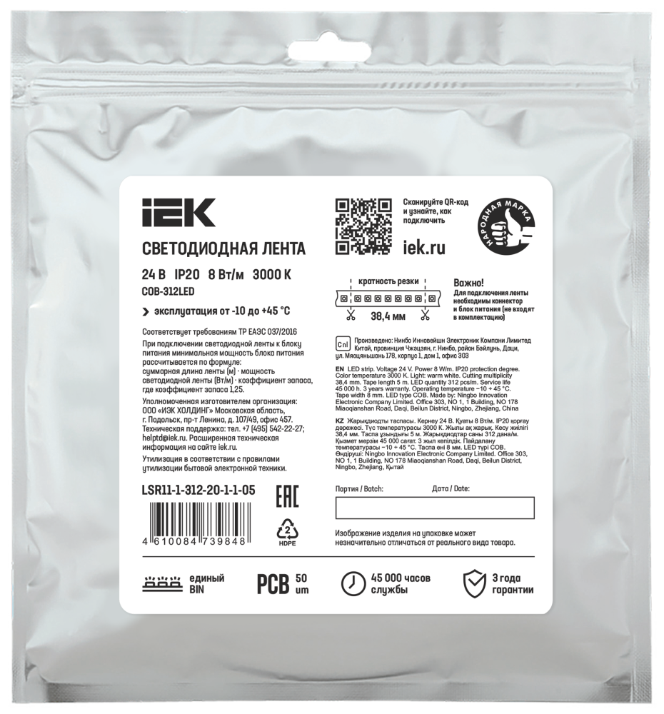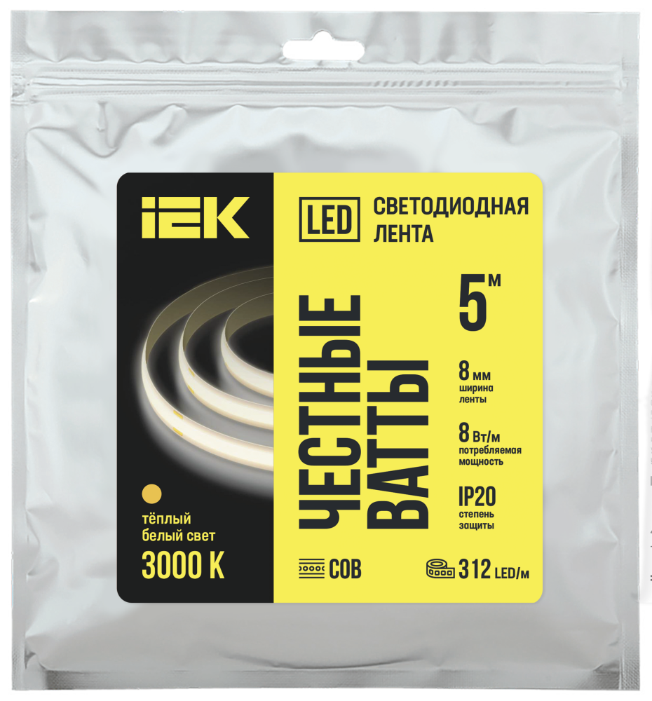Полное описание товара Лента LED 5 м COB-312LED 8 Вт/м IP20 8 мм 24 В 3000К (IEK) LSR11-1-312-20-1-1-05