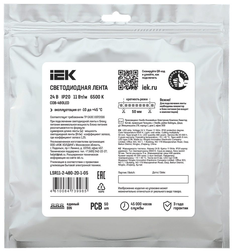 Полное описание товара Лента LED 5м COB-480LED 11Вт/м IP20 8мм 24В 6500К (IEK) LSR11-2-480-20-1-05