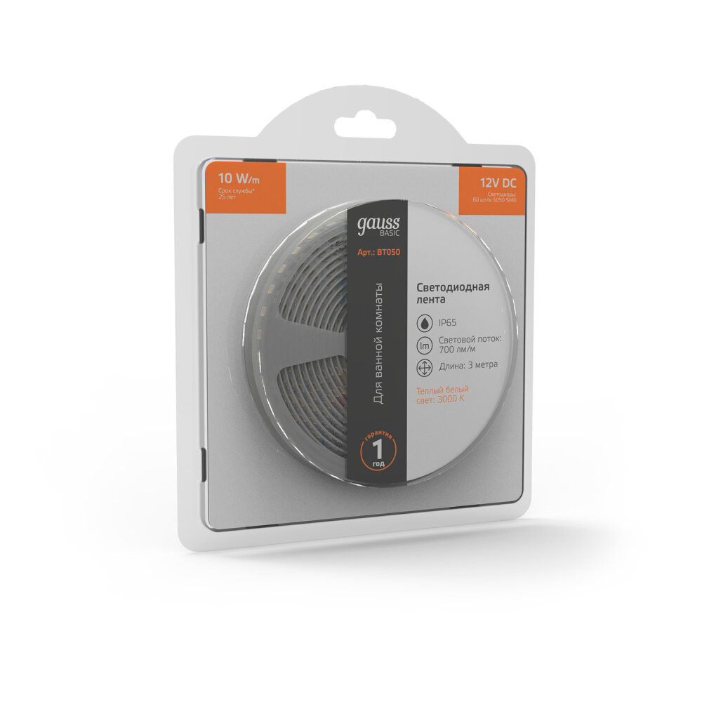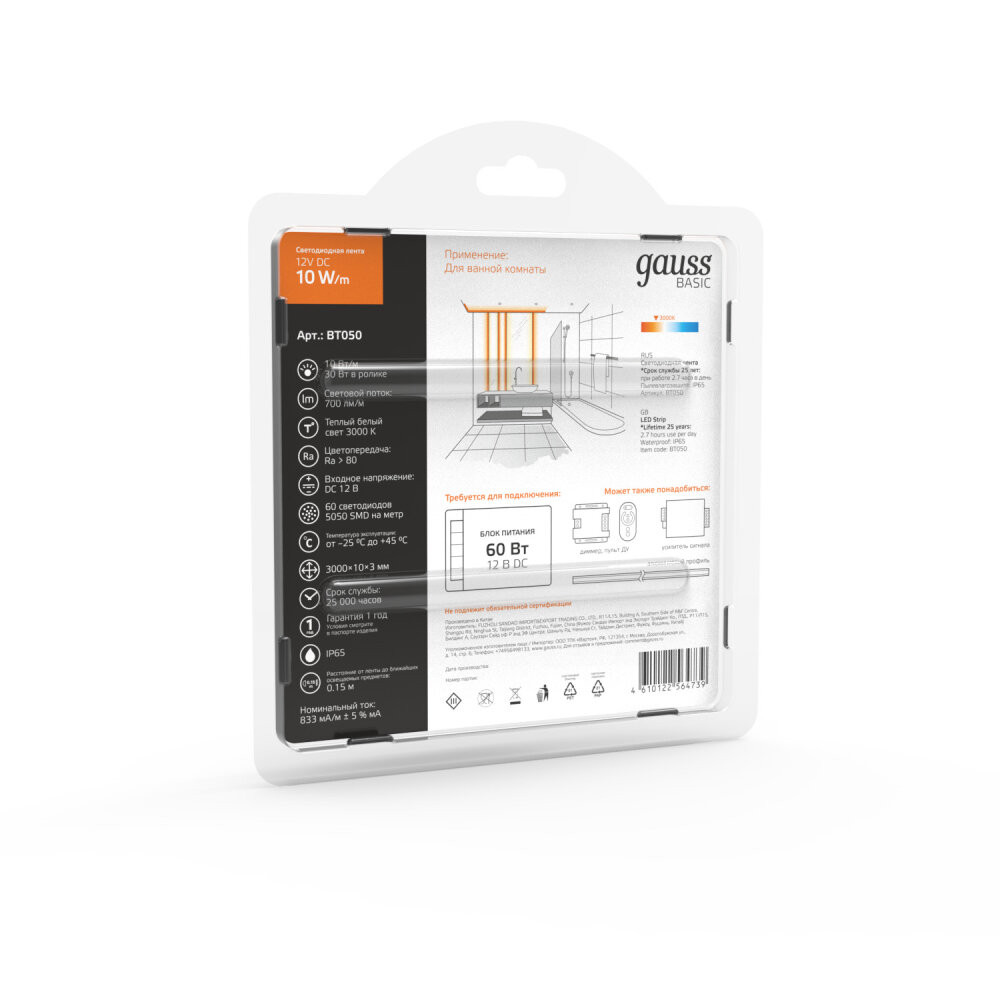 Полное описание товара Лента светодиодная 10 Вт/м 12В 3000К IP65 60LED/м SMD5050 (блистер 3м) 700 лм/м Basic Gauss (GAUSS) BT050