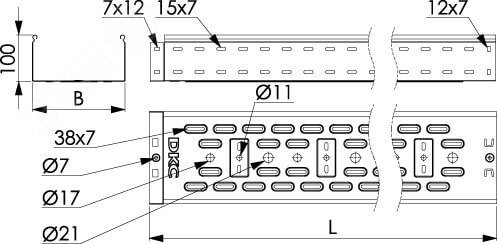 Перфорированные листовые лотки ДКС применяются для прокладки кабеля как в помещении, так и на открытом воздухе. Лотки отличаются высокой несущей способностью - подформовка, производимая при производстве этой продукции, создает дополнительное ребро жесткости, что увеличивает несущую способность системы до 54%. Перфорация сокращает вес конструкции. В лотках имеются отверстия для отвода кабеля диаметром 11 мм, 17 мм, 21 мм. Степень пыле- и влагозащиты перфорированных лотков - IP10 при использовании крышек, входящих в состав системы. Метод соединения ''мама-папа'' применяемый для системы, существенно сокращает время монтажа и создает непрерывный контур. Конструктив листовых лотков ДКС предупреждает повреждение кабеля при прокладке. Толщина стали - 0.9 мм, высота лотка - 100 мм, ширина - 400 мм, длина - 3000 мм. Полезное сечение - 39500 мм. Исполнение - ''сталь, оцинкованная по методу Сендзимира''.