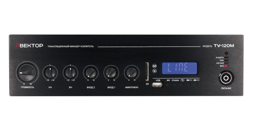 Полное описание товара Микшер-усилитель комбинированный компактный, мощность 120 Вт, цифровой FM тюнер, MP3 плеер, USB, SD, Bluetooth, питание 220 В, рэковое крепление (ВЕКТОР) ТУ-120М