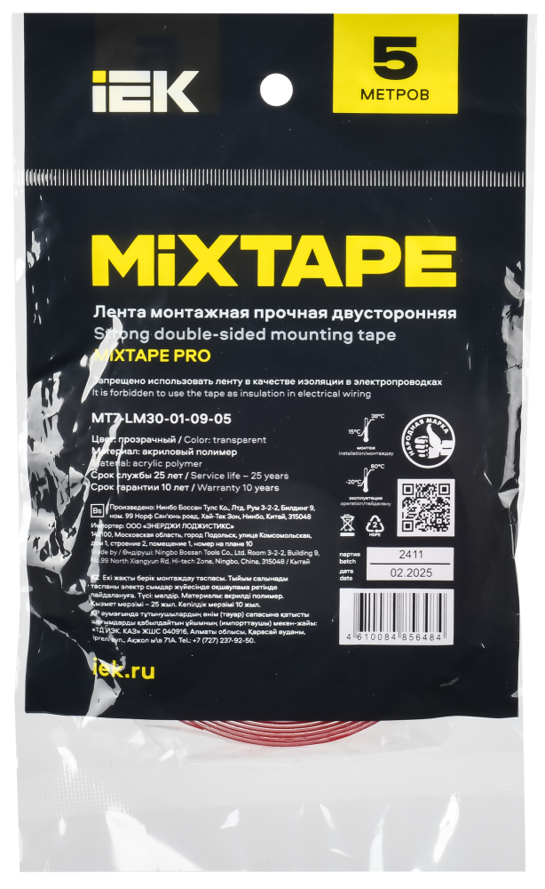 Двусторонняя прозрачная монтажная лента IEK MIXTAPE PRO на акриловой основе предназначена для надежного крепления и соединения различных материалов как в помещениях, так и на улице. Подходит для ремонта и монтажа навесных конструкций, информационных материалов, крепления молдингов, зеркал, декоративных деталей и других аксессуаров.