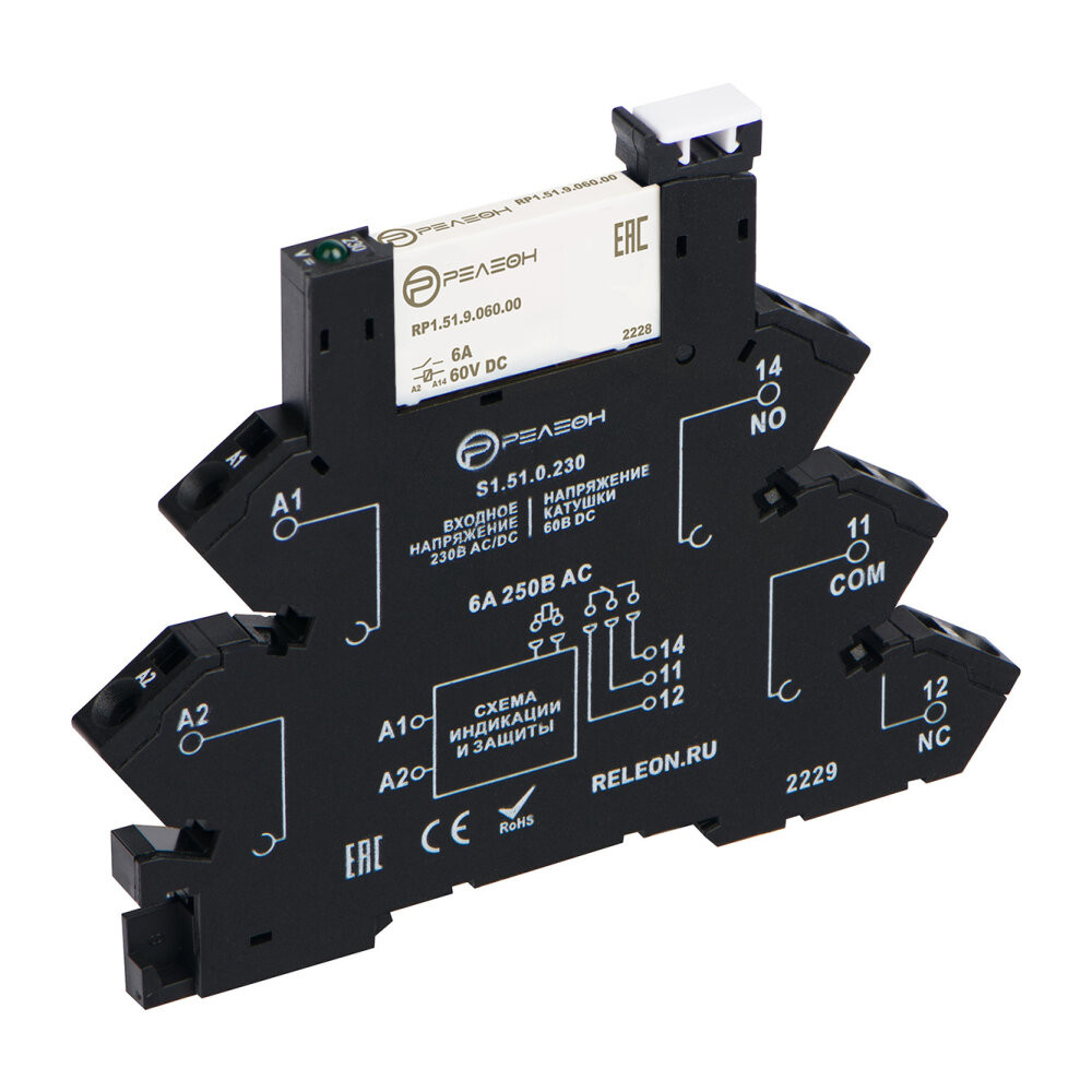 Модуль интерфейсный реле, 1 перекидной контакт 6А 230В AC/DC пружинные зажимы (Релеон) RM161023000