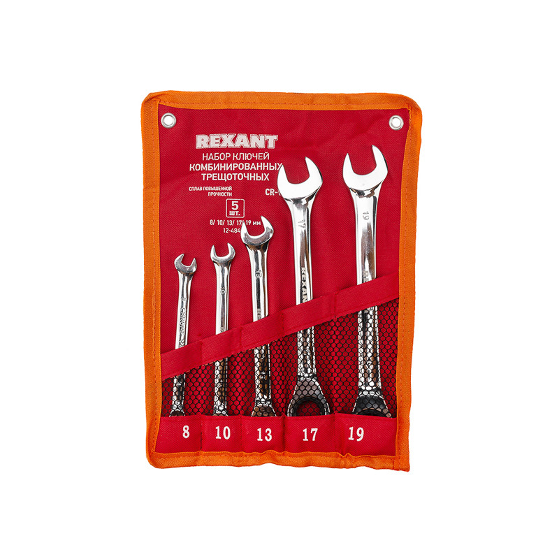 Набор ключей комбинированных трещоточных (8, 10, 13, 17, 19 мм), CrV (REXANT) 12-4841-1