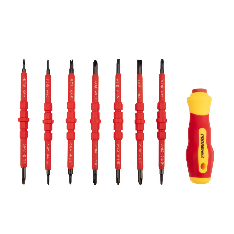 Набор отверток PROconnect 8 в 1 предназначен для электромонтажных работ, монтажа/демонтажа крепежных соединений - шурупов, саморезов и т. д. Двухсторонние диэлектрические стержни отвертки из высококачественной хромованадиевой стали с оксидированными намагниченными наконечниками покрыты специальным изоляционным материалом. Корпус эргономичной изолированной рукоятки выполнен из пластика, не скользит в ладони, что обеспечивает дополнительный комфорт при работе. Набор поставляется в пластиковом боксе для удобства хранения и транспортировки.