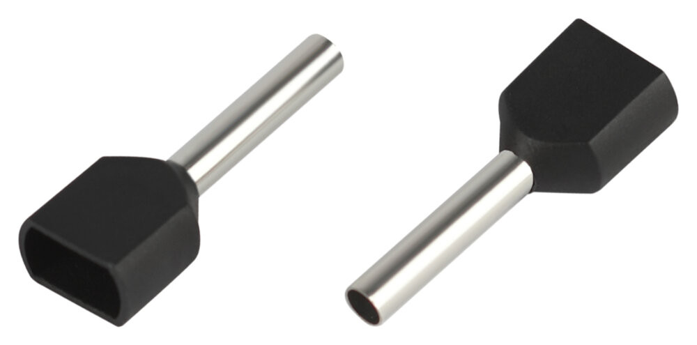 Наконечники-гильзы НШвИ(2) двойные предназначены для использования с двумя проводниками: для оконцевания гибких многопроволочных медных проводников методом опрессовки для последующей фиксации в клемме или нулевой шине. Заменяют обязательный процесс облуживания многопроволочных медных проводов (типа ПВ-3, ПВС и т. п.) Наконечники-гильзы представлены в двух исполнениях для использования с одним и двумя проводниками. Коническая форма внутренней части манжеты облегчает заведение гибкого многопроволочного проводника в наконечник, т.к. изготовлена по технологии ''Easy-Entry''/''Быстрый ввод''. Изолирующая манжета служит ограничителем и одновременно дополнительно фиксирует провод по изоляции, предотвращая его излом. Цветовая маркировка изолирующих манжет выполнена в соответствии с DIN 46228 часть 4, позволяет быстро подобрать нужный размер наконечника под сечение проводника.