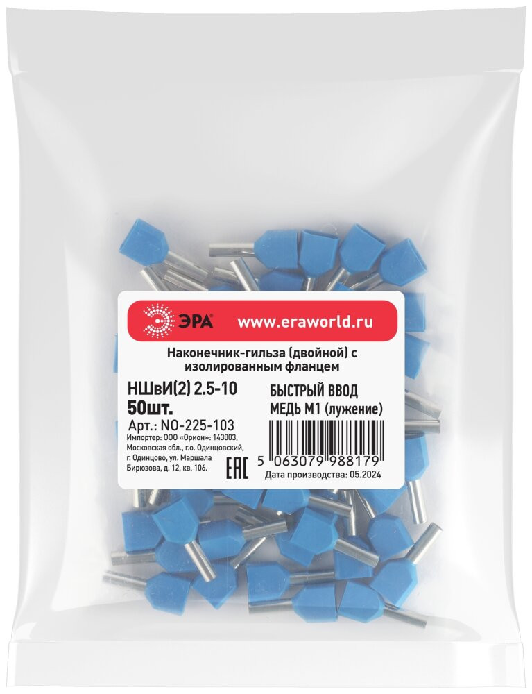 Полное описание товара Наконечник-гильза с изолированным фланцем (упаковка 50 шт.) NO-225-103 (двойной) НШвИ(2) 2,5-10 (ЭРА) Б0063338