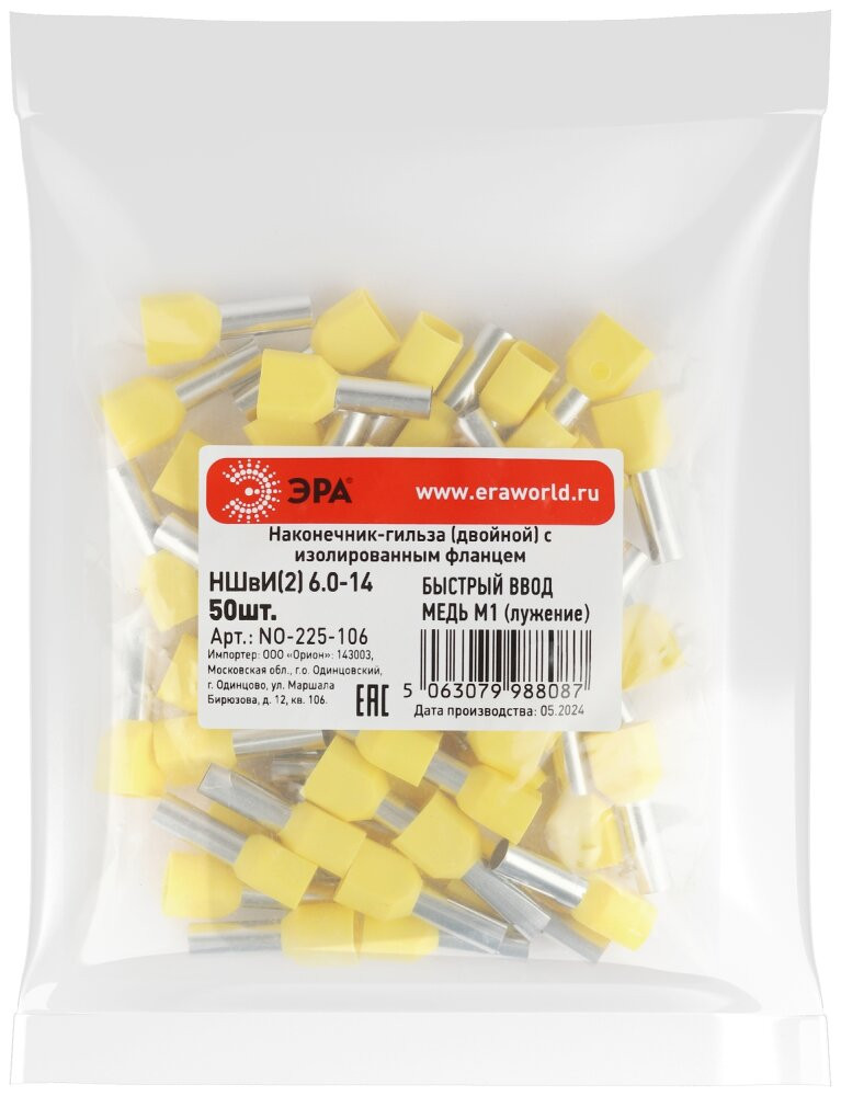 Наконечник-гильза с изолированным фланцем (упаковка 50 шт.) NO-225-106 (двойной) НШвИ(2) 6,0-14 (ЭРА) Б0063296