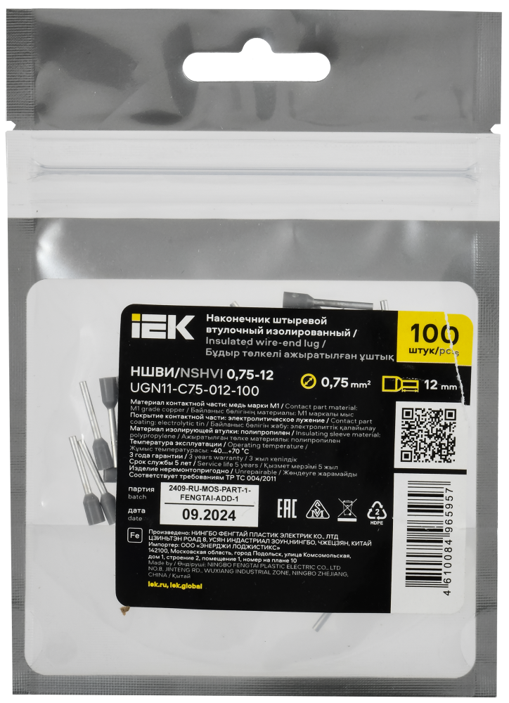 Полное описание товара Наконечник НШВИ 0,75-12 серый (100шт/упак) IEK (IEK) UGN11-C75-012-100