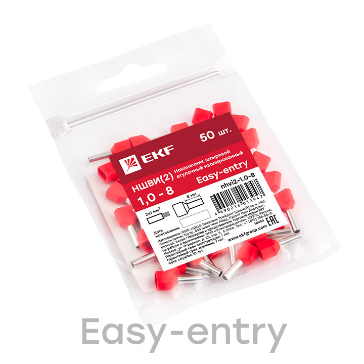 Полное описание товара Наконечник штыревой втулочный изолированный НШвИ (2) 1.0-8 (50шт) (EKF) nhvi2-1.0-8