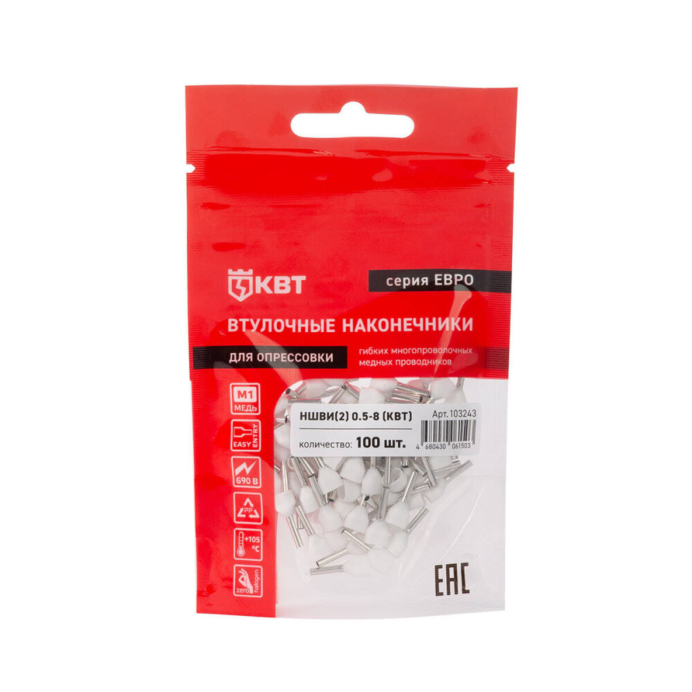 Наконечник штыревой втулочный изолированный НШВИ(2) 0,5-8 серия ЕВРО (100 шт) (КВТ) 103243