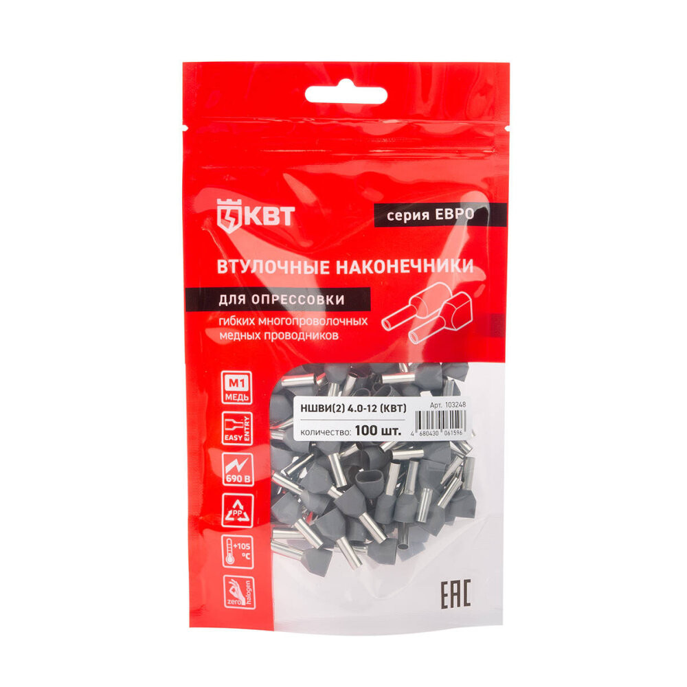 Полное описание товара Наконечник штыревой втулочный изолированный НШВИ(2) 4,0-12 серия ЕВРО (100 шт) (КВТ) 103248