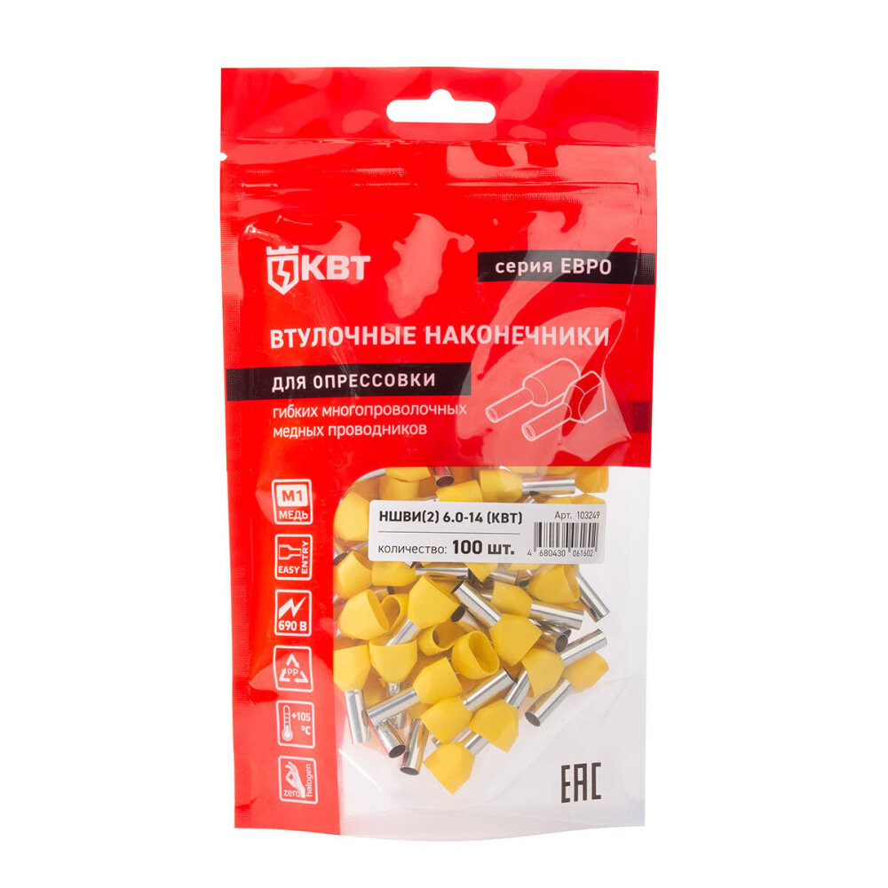 Наконечник штыревой втулочный изолированный НШВИ(2) 6,0-14 серия ЕВРО (100 шт) (КВТ) 103249