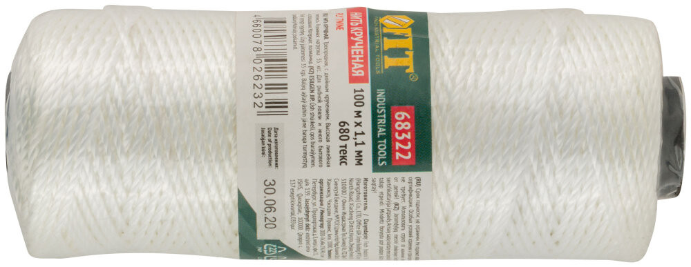 Полное описание товара Нить крученая на бобине 1.1 мм х 100 м, 680 текс, р/н=35 кгс, белая (FIT) 68322