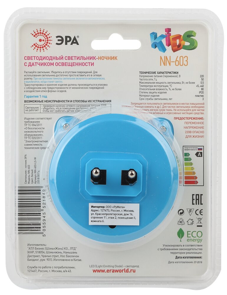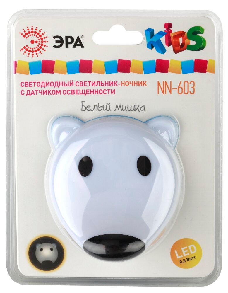 Ночник NN-603-LS-W `Белый мишка` со светодиодами (LED) в качестве источников света и встроенным датчиком освещенности. Включается автоматически, если вокруг темно, и также сам гаснет с рассветом. Среди множества вариантов ночников миниатюрные модели, вставляющиеся в розетку - одни из самых удобных. Светодиодные ночники ЭРА успешно выполняют свою основную функцию - создают мягкий рассеянный свет. Они отличаются мизерным энергопотреблением, которое будет незаметно в общем счете за электроэнергию. При необходимости можно смело оставлять их включенными ночи напролет. Современная LED технология исключает пульсации света, освещение ровное и приглушенное - то, что нужно для комфортного сна или ночной подсветки. Упаковка позволяет проверить работу ночника, не доставая его из блистера, нужно только включить его в розетку и прикрыть датчик освещенности рукой.
