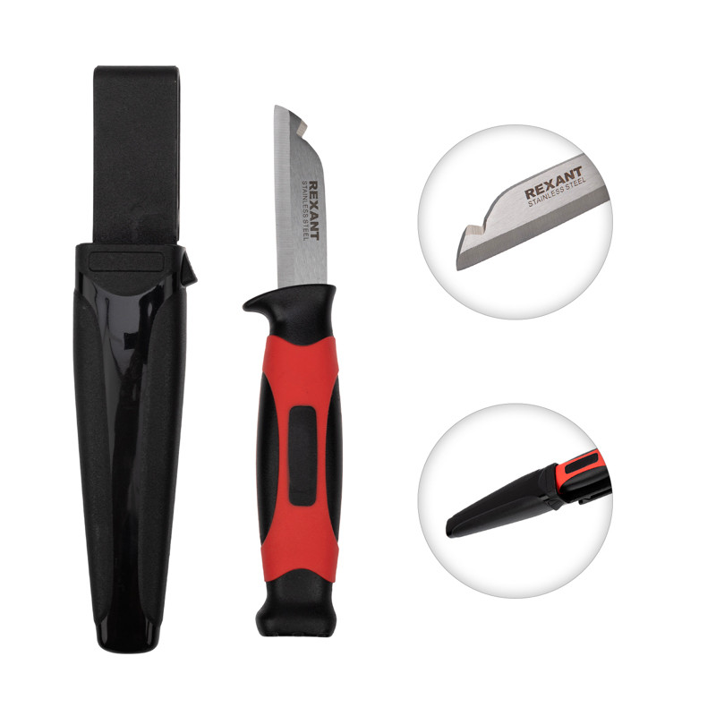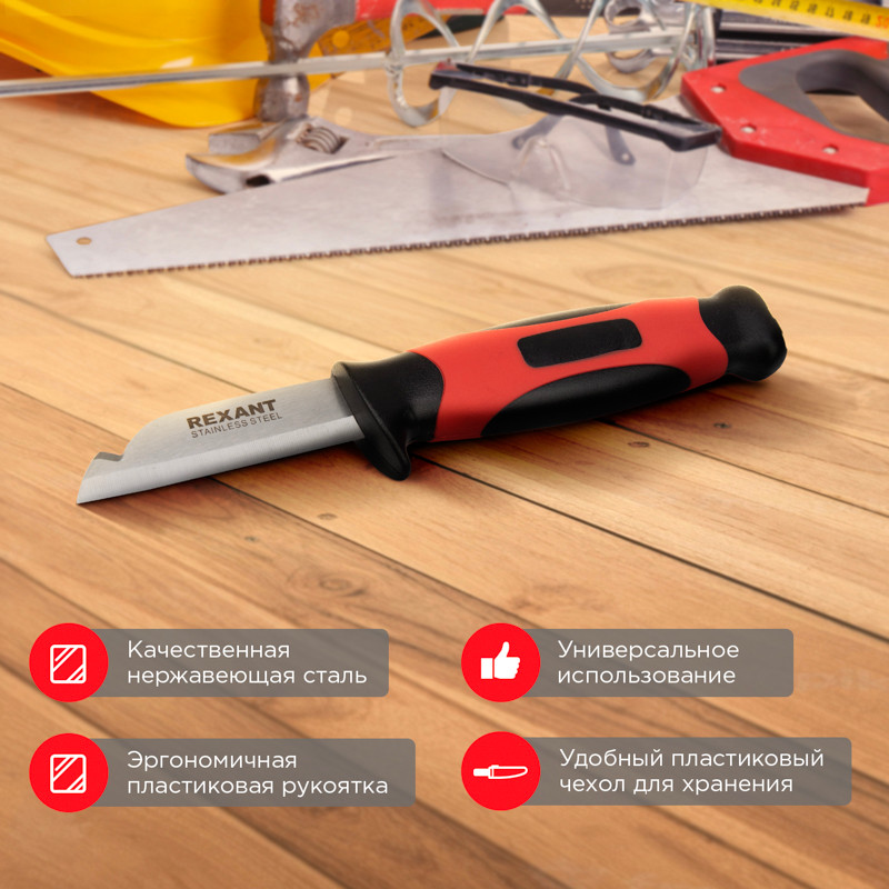 Универсальный нож монтажника REXANT предназначен для проведения отделочных, ремонтно-строительных работ, пригоден в походах, на рыбалке, во время туризма. Инструмент изготовлен из прочных и надежных материалов, благодаря чему имеет повышенный рабочий ресурс. Лезвие, выполненное из высококачественной стали, обладает двухсторонней заточкой, которая обеспечивает чистоту и точность реза. Двухкомпонентная прорезиненная рукоятка не скользит в ладони, что создает дополнительный комфорт во время работы. Для удобства хранения и транспортировки нож укомплектован пластиковым чехлом с клипсой, благодаря которой инструмент можно фиксировать на одежде.