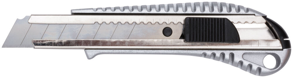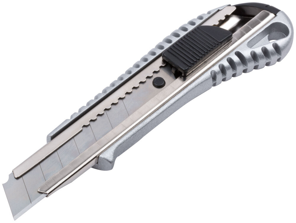 Применяется для резки бумаги, обоев, скотча, картона средней твердости. Рифленая форма ножа обеспечивает крепкий захват и предотвращает выскальзывание при использовании. Компактный корпус изготовлен из алюминиевого сплава, сегментированное лезвие из высокоуглеродистой инструментальной стали состоит из 15 сегментов, гарантирует устойчивость во время работы. Нож имеет металлические направляющие и фиксатор лезвия.