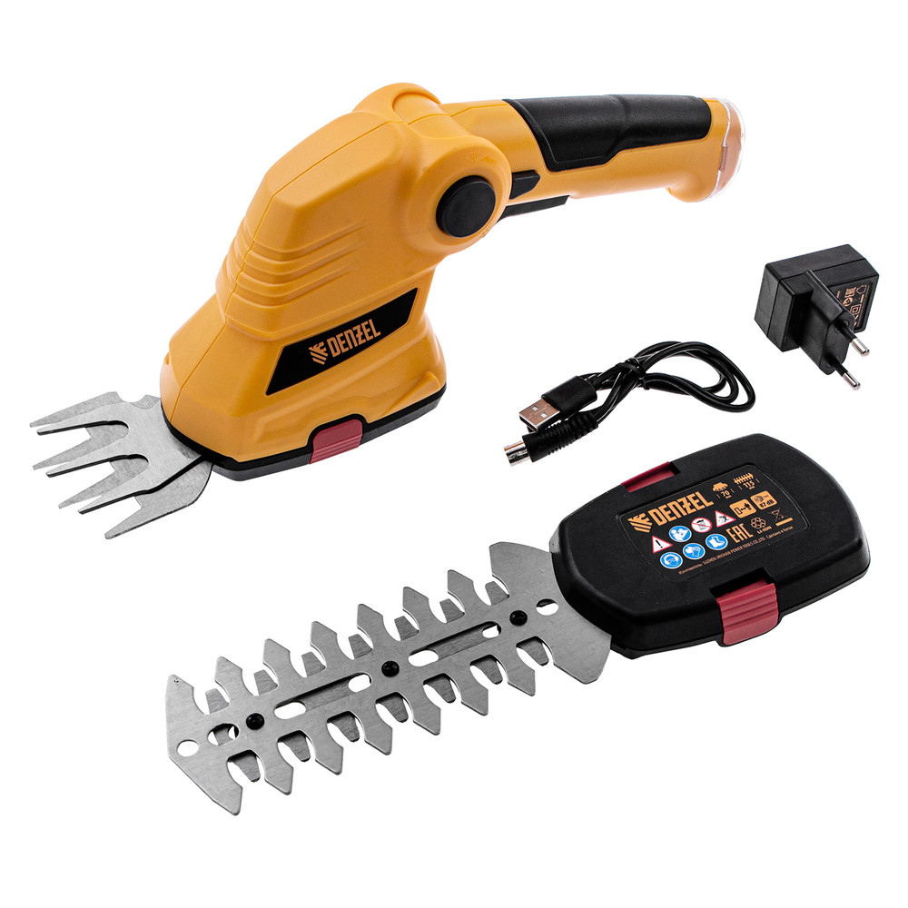 Аккумуляторные ножницы-кусторез Denzel G411 968177 с Li-Ion батареей напряжением 3,6 В и емкостью 1,5 Ач предназначены для поддержания декоративной растительности на дачном участке в аккуратном виде. В комплект входят две оснастки: для подрезания газонной травы и для обрезки кустов и тонких веток деревьев. Благодаря простому управлению и малому весу 0,6 кг с ножницами-кусторезами легко справятся даже пожилые люди.