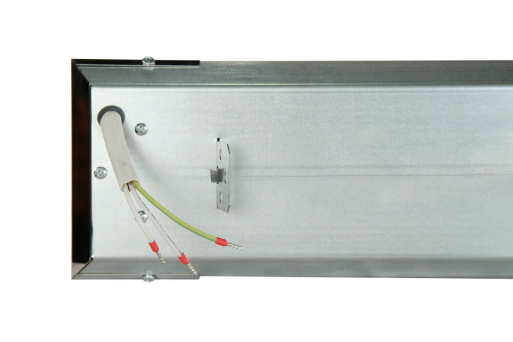 - Преимущества: Трапецевидный компактный корпус из оцинкованной стали с видимой частью из блестящей нержавеющей стали|Монолитный нагреватель с рассеивающей панелью из анодированного алюминия|Отгибаемые пластины и метизы для подвеса в комплекте|Кабель выведен из корпуса, не нужно вскрывать прибор для подключения|Степень защиты IP20