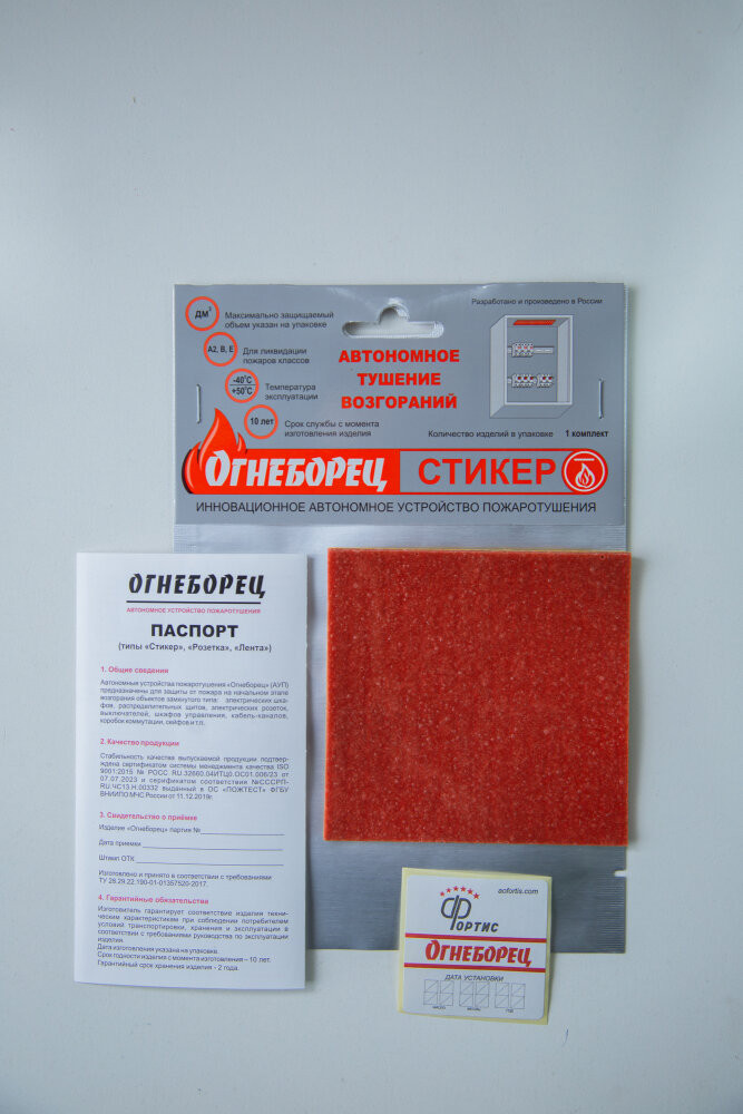 СтикерАО Фортис ''Огнеборец'' стикер 25, (1 шт. в одной упаковке) - это автономное устройство пожаротушения (АУП) на основе термоактивируемых микрокапсулированных огнетушащих веществ. Предназначено для тушения возгораний в малых закрытых объемах — щиты и другие электрораспределительные устройства, объемом до 25 л. Выполнено с применением микрокапсул с газом. При взаимодействии с огнем, микрокапсулы разрушаются и газ выходит наружу. Происходит реакция ингибирования огня. Благодаря тому, что создается определенная концентрация огнетушащего вещества, повторное возгорание сразу невозможно. Стикер имеет алюминиевую подложку, что при нагревании устройства дает равномерное распределение температуры по всей поверхности стикера и обеспечивает равномерный выход вещества. Крепление в виде скотча марки 3М, красный флуоресцентный цвет активного слоя, рельефное нанесение для увеличения площади поверхности.