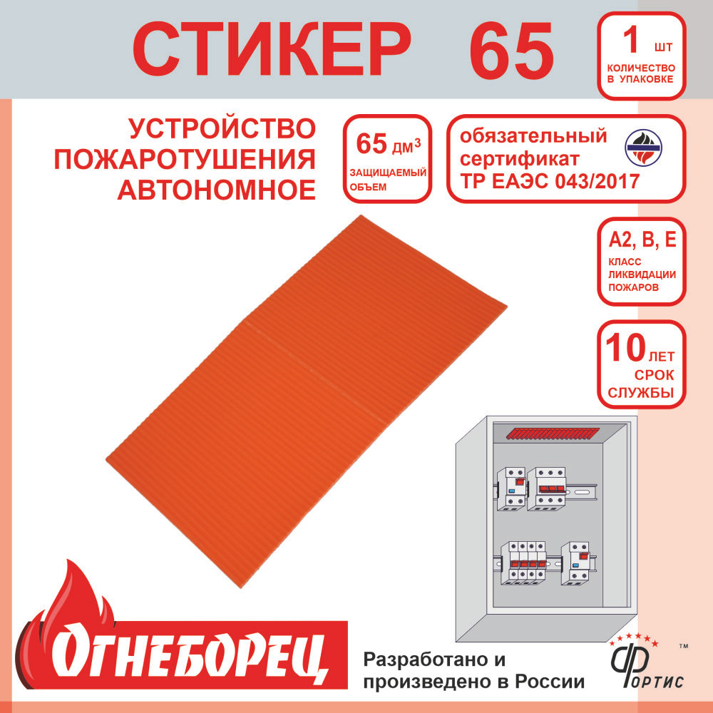 СтикерАО Фортис ''Огнеборец'' стикер 65, (1 шт. в одной упаковке) - это автономное устройство пожаротушения (АУП) на основе термоактивируемых микрокапсулированных огнетушащих веществ. Предназначено для тушения возгораний в малых закрытых объемах — электрощиты, шкафы управления и другие электрораспределительные устройства, объемом до 65 л. Выполнено с применением микрокапсул с газом. При взаимодействии с огнем, микрокапсулы разрушаются и газ выходит наружу. Происходит реакция ингибирования огня. Благодаря тому, что создается определенная концентрация огнетушащего вещества, повторное возгорание сразу невозможно. Стикер имеет алюминиевую подложку, что при нагревании устройства дает равномерное распределение температуры по всей поверхности стикера и обеспечивает равномерный выход вещества. Крепление в виде скотча марки 3М, красный флуоресцентный цвет активного слоя, рельефное нанесение для увеличения площади поверхности.