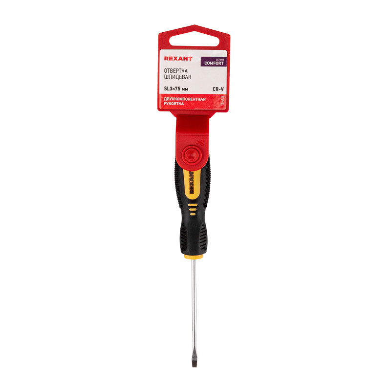 Полное описание товара Отвертка шлицевая SL3х75 мм, двухкомпонентная рукоятка (REXANT) 12-4721