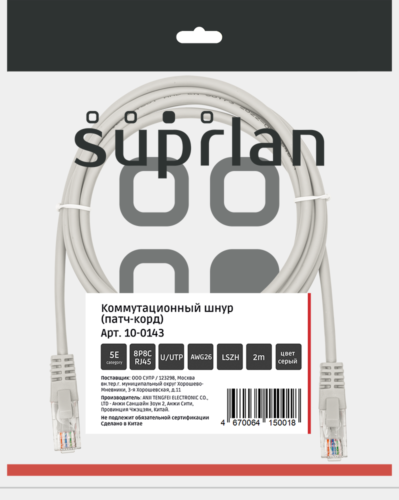 Полное описание товара Патч-корд UTP 5e 4x2 26AWGCu LSZH серый 2м (SUPRLAN) 10-0143