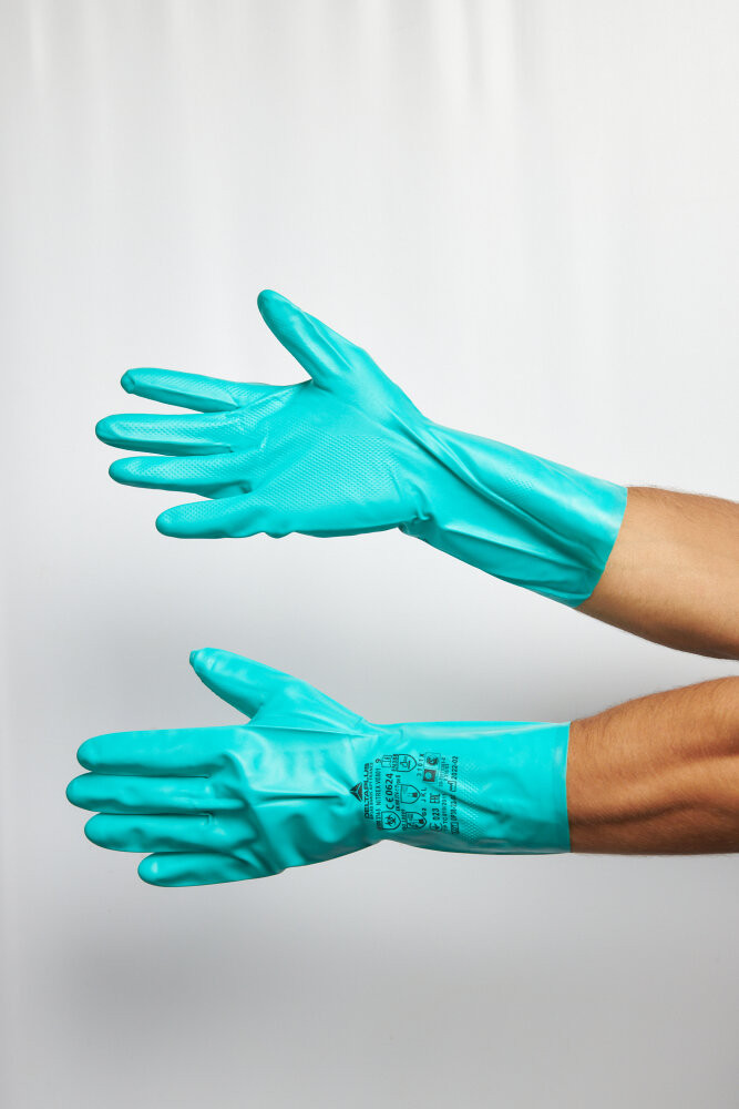 Перчатки VE801 химически стойкие нитриловые размер 9. Цвет - Зеленый. Рельефная структура на ладонной части и пальцах обеспечивает хороший захват, препятствует выскальзыванию предметов из рук. Длина – 33 см. Толщина - 0,4 мм.