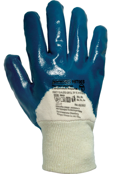 Защитные перчатки на х/б основе с частичным нитриловым покрытием. Усиленное покрытие обеспечивает повышенную стойкость к тяжелым механическим нагрузкам. Основа перчатки ''джерси'' (трикотажное ворсистое полотно из 100% хлопка) впитывает влагу, обеспечивает термоизоляцию и комфорт рук во время работы. Манжета резинка для хорошей фиксации на руке.