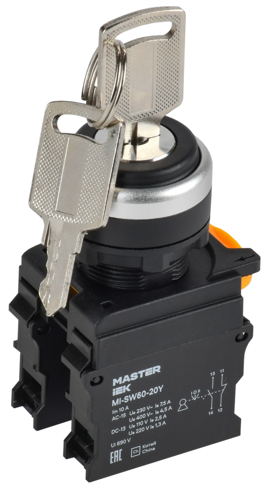 Полное описание товара Переключатель с ключом на 3 положения 2NO чёрный MASTER (IEK) MI-SW60-20Y-3-34-3-K02
