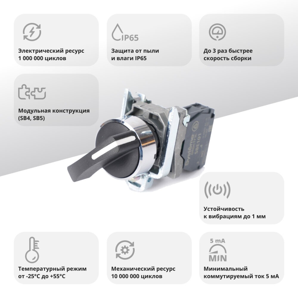 Полное описание товара Переключатель SB4 в сборе модульный 22мм 2 позиции с фиксацией ручка 1НО (Systeme Electric) SB4BJ21