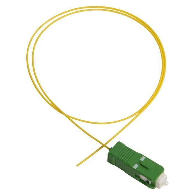 Пигтейл – отрезок оптоволоконного кабеля в буферном покрытии диаметром 0.9 мм, оконеченный с одной стороны оптическим коннектором. Второй его конец предназначен для сращивания с оптическим волокном другого оптического кабеля. Сращивание происходит при помощи сварки или механических неразъемных соединений. Корпус оптического коннектора изготовлен из пластика. Тип разъема –pSC. Коннектор фиксируется в оптической розетке при помощи защелки. Тип полировки коннектора – APC.