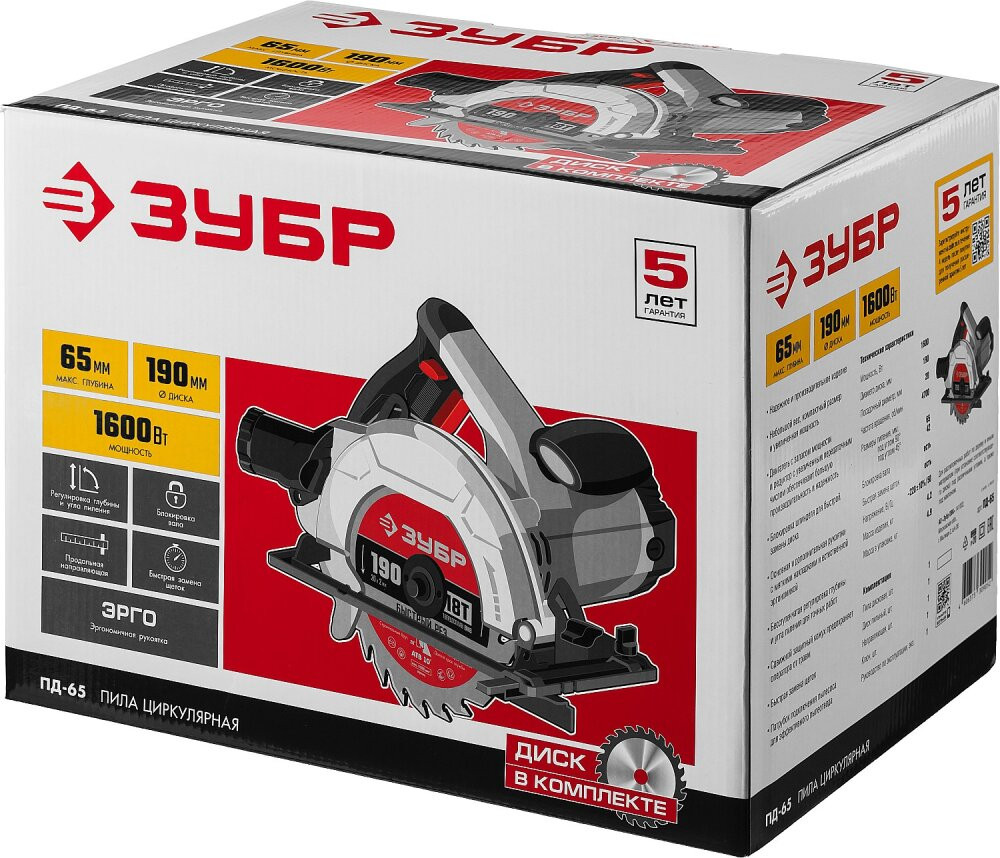 Пила дисковая, диск 190 мм, 1600 Вт (ЗУБР) ПД-65